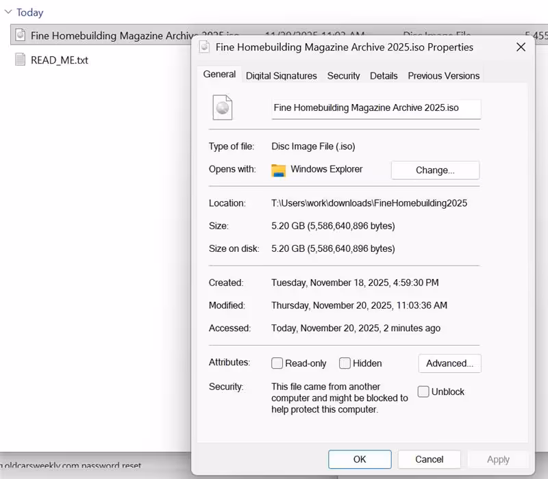 This is a tutorial for downloading and opening the 2025 Active Interest Media back issue library archive software on Windows 11. So after you make your purchase, you will be met with a receipt page here which will have the download link. Otherwise you will get two emails, one a receipt email, one a confirmation email, the receipt email will lead back to this page so we'll have the download link and the confirmation email will lead to this page which will also have the same download link. So click on one of these and then it should start your download and then we'll fast forward a bit. Once you have the file downloaded then it should be near downloads folder so in any browser you use it should be up here the downloads icon a little downward pointing arrow so you can see in Chrome it's right here in Edge it is right here so that arrow should eventually take you you click a little folder icon here and then it should take you to downloads folder directly which one ever specified in your browser settings. Otherwise if you need to navigate to it apart from that you can click on the start menu icon and start typing downloads and it should get you here or you can go my computer or this PC and click on that and then it's usually in local disk C and then users and your username and then there should be a downloads link. So any of those methods will take you here and after you've gotten to the downloads folder you can right-click it and then extract all and this should pop up extract and then wait a few minutes for it to finish. After it's done extracting it should take you into the folder here in the little bit two files they'll be a read me which will contain the same information in this tutorial video and there'll be the ISO file so you probably don't need to click the read me if you're watching this but you could if you need further explanation otherwise just click the ISO file or double click it and then Windows 11 has smart app control which sometimes tends to block this ISO file that's for probably new installs of Windows it's installed on not on ones that have been migrated from Windows 10 so if you encounter this message right click on the ISO file click show more options click properties and then there'll be a check mark box here to unblock it so check this apply okay and then double click this and then it'll mount it as a virtual hard drive to your computer here and then at this point you can just click start here it'll open your default browser and then if this message pops up here at the top click allow and then you should be good to go if you need to get back into it if you go to this PC note that it is mounted right here so we can eject it and then to get back into it you go to downloads folder again and then go to the ISO file again double click it and it remounts it and then click start here again